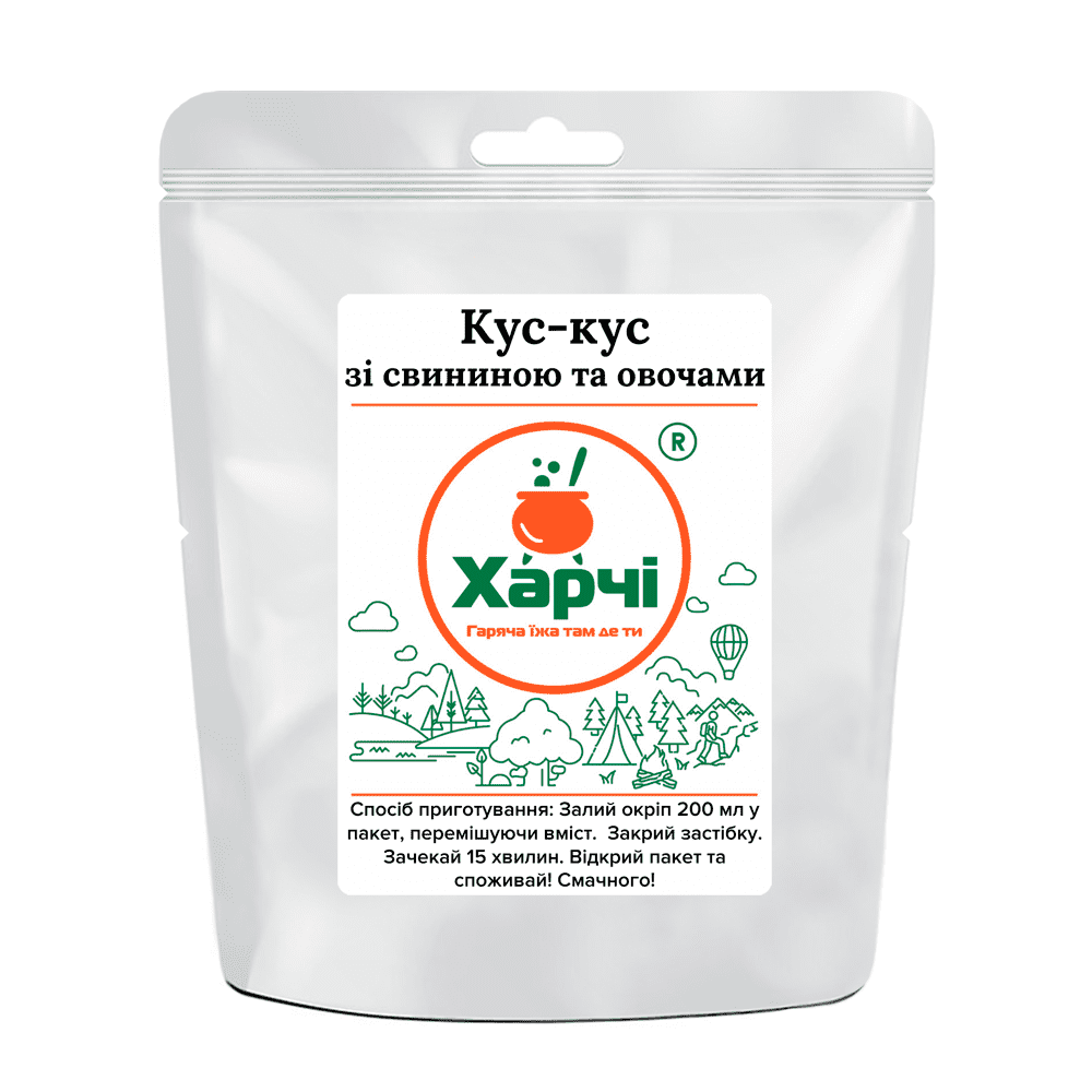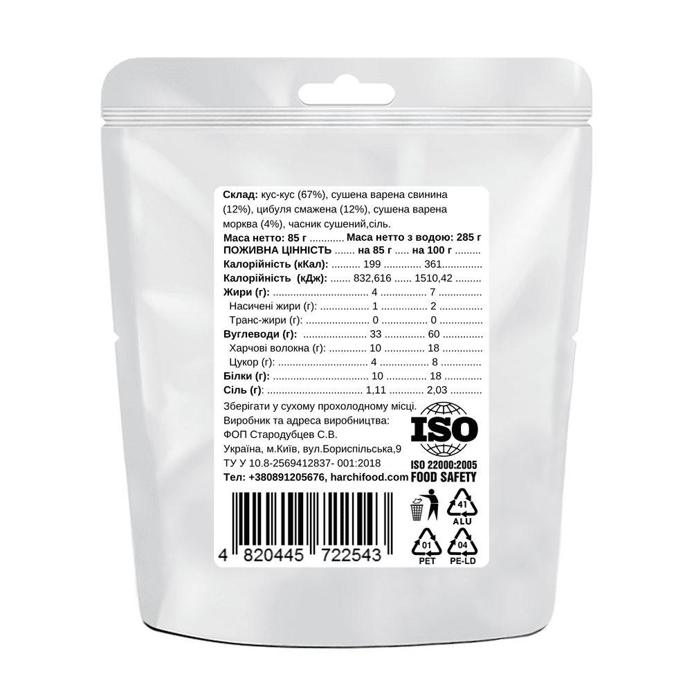 Склад: кус-кус (67%), сушена варена свинина (12%), цибуля смажена (12%), cушена варена морква (4%), часник сушений, сіль.