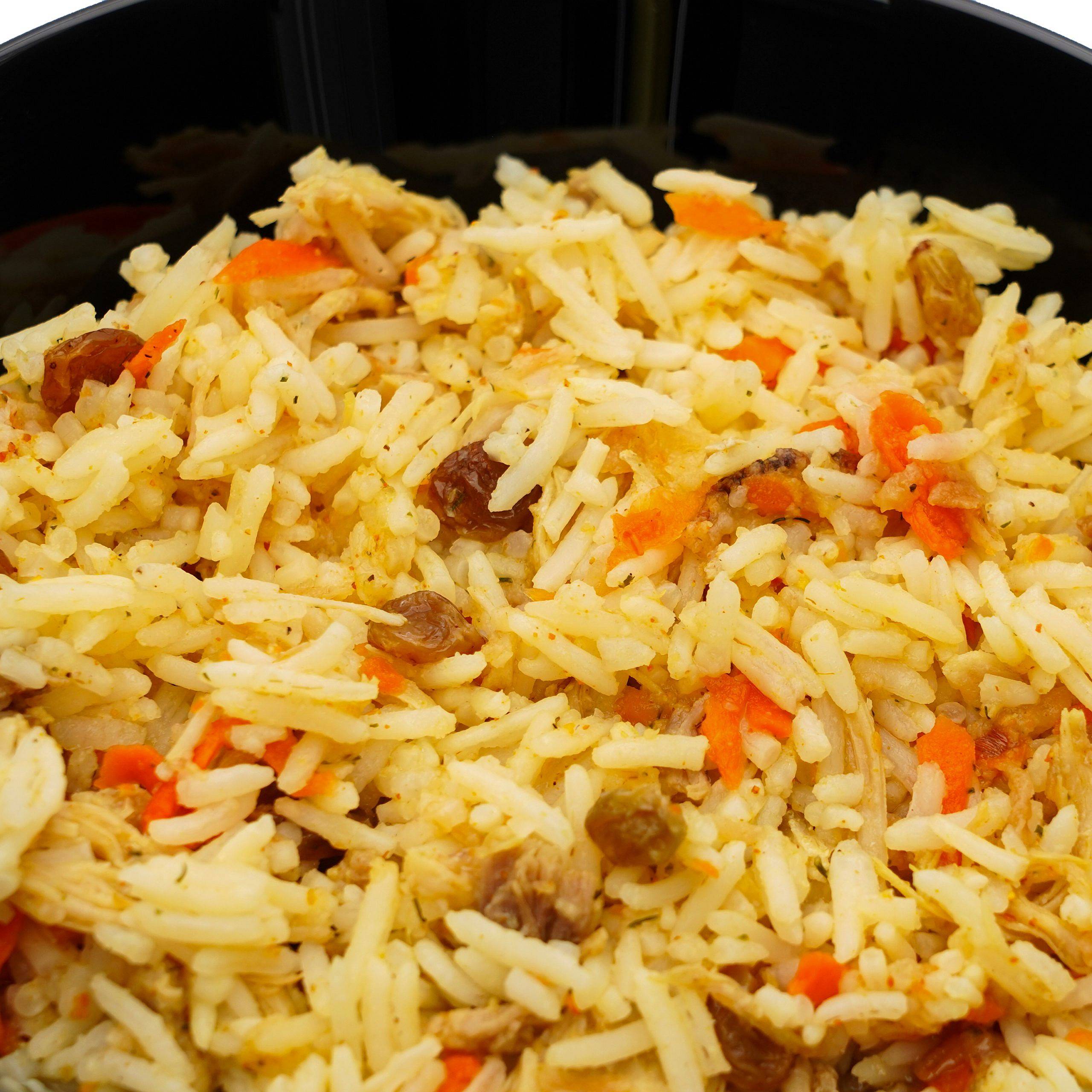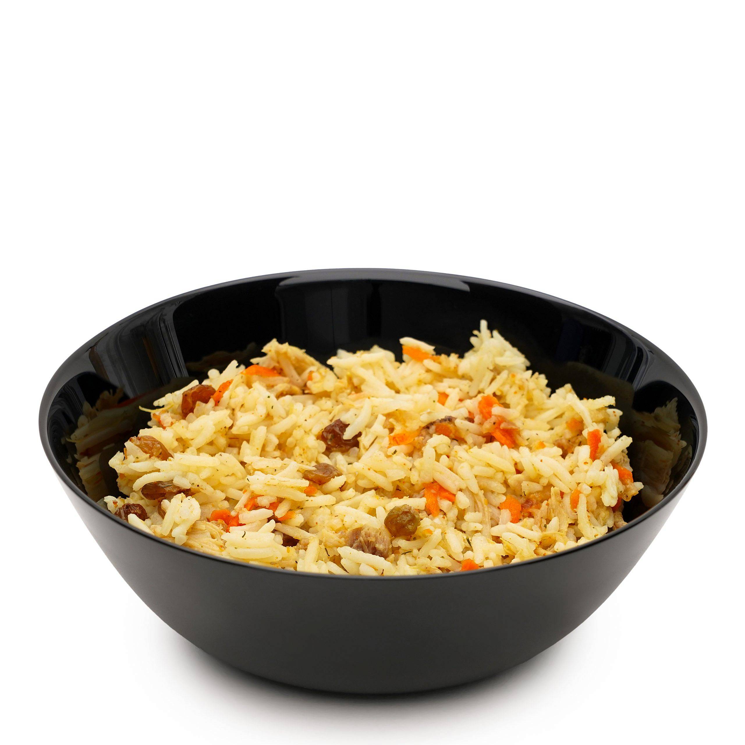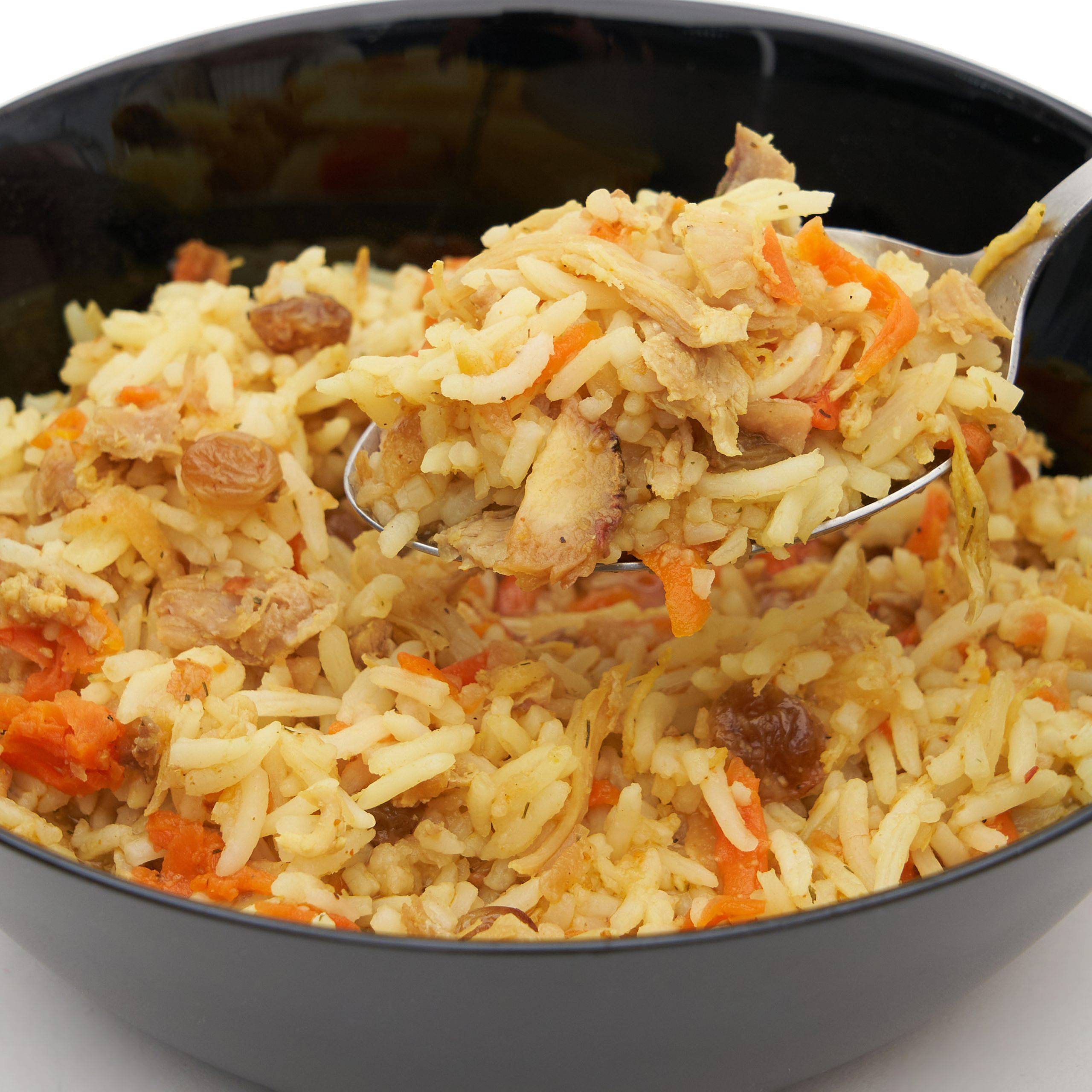Склад: рис “Басматті” дегідрований (50%), курка дегідрова (20%), морква солодка дегідрована (10%), цибуля смажена, сушена (5%), родзинкі (5%), суміш спецій “до плову”, сіль.