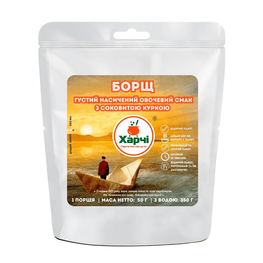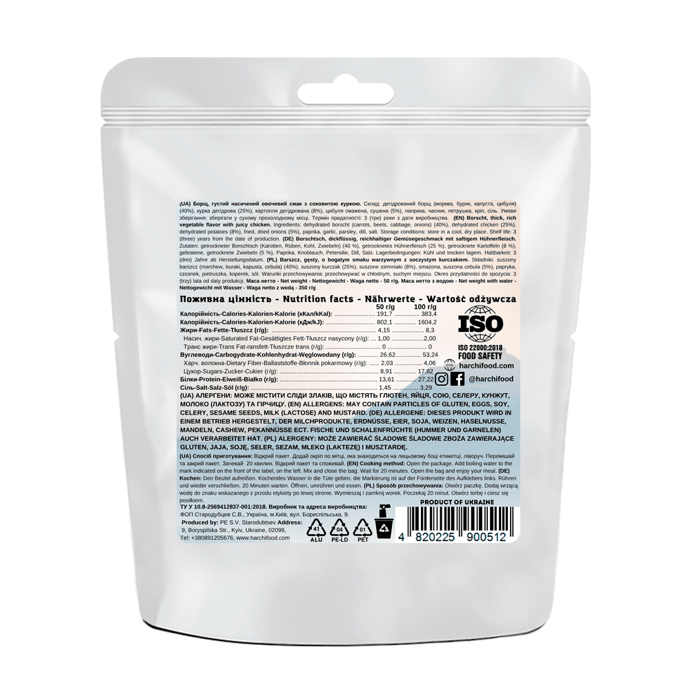Склад: дегідрований борщ (морква, буряк, капуста, цибуля) (40%), курка дегідрова (25%), картопля дегідрована (8%), цибуля смажена, сушена (5%), паприка, часник, петрушка, кріп, сіль. Умови зберігання: зберігати у сухому прохолодному місці.